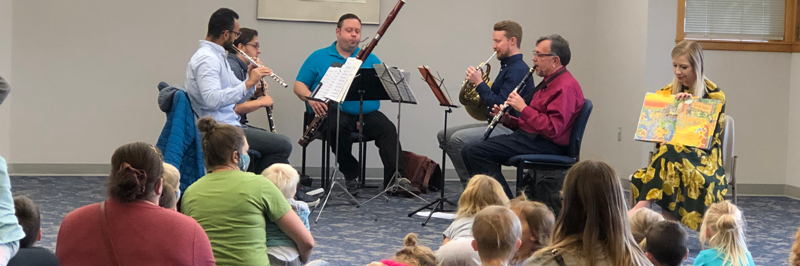 The SDSO in partnership with Siouxland Libraries present Symphony Storytime where music helps to tell the story as chosen by our Dakota Wind Quintet or Dakota String Quartet. Preschool aged children are invited to local libraries around the Sioux Falls area for this fun and unique storytime. These 30 minute presentations allow time for the musicians to talk about their instruments and answer questions for the young audience.